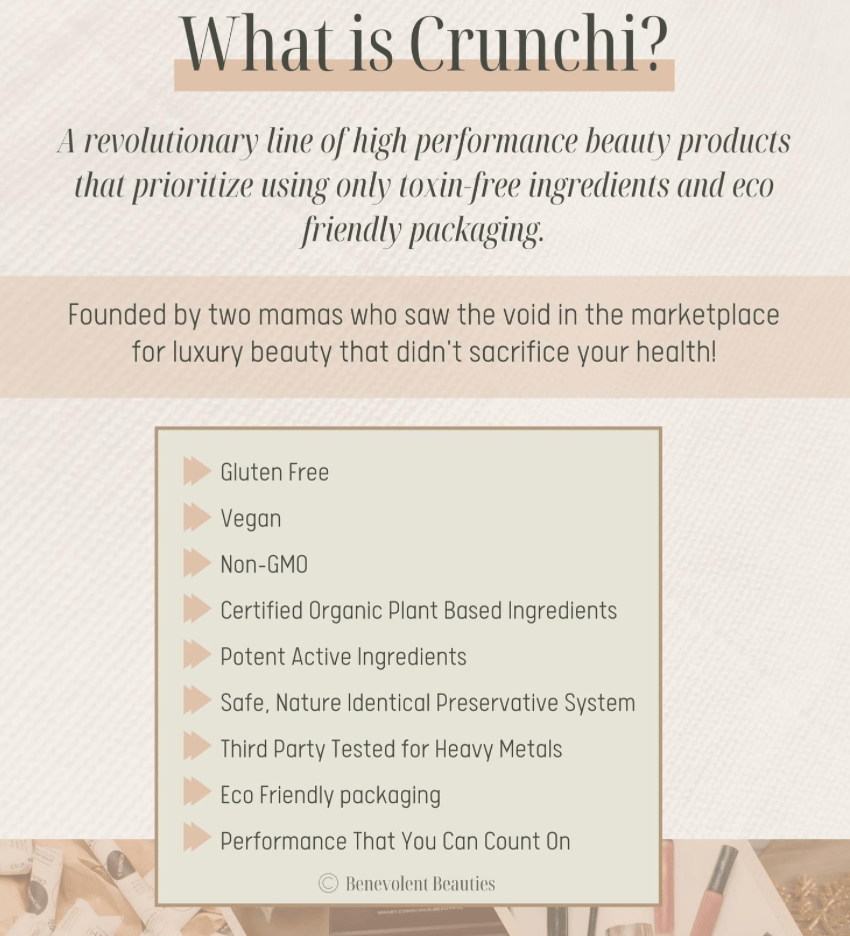 I’ve tried a few different “toxin free” skincare brands, and have usually been disappointed in either their quality, or their honesty, or their integrity. Crunchi goes above and beyond in every aspect to make sure their products are not only completely toxin free, but high performing too! Let me tell you a little bit about WHY I choose Crunchi…